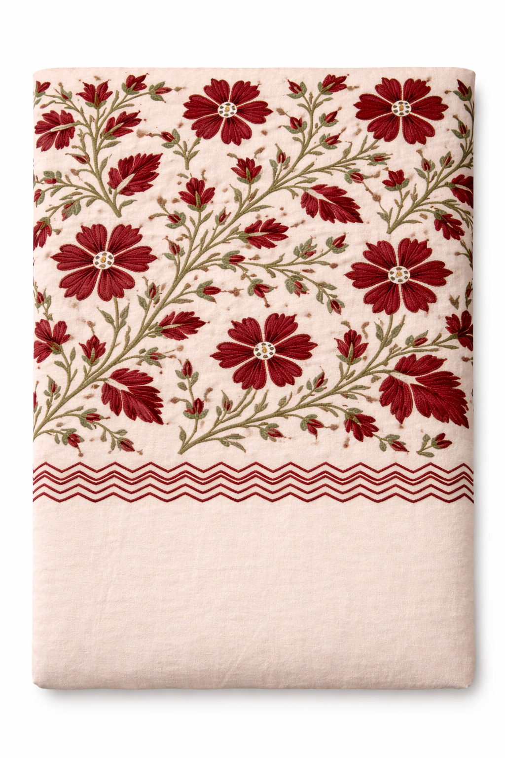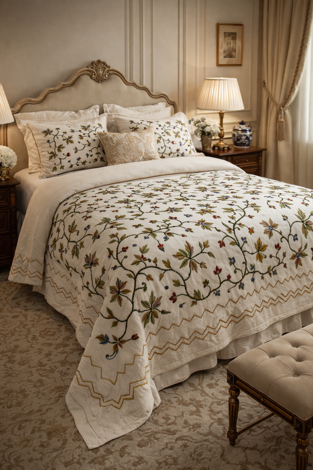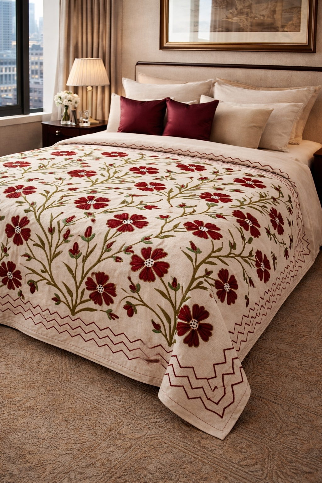 An ivory bedcover with crimson Kashmiri florals, adding warmth and understated elegance.
