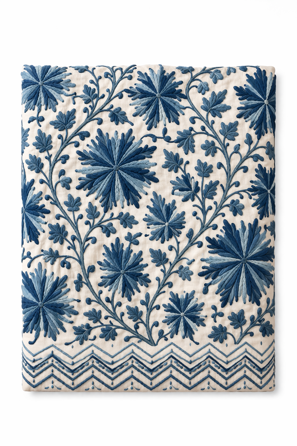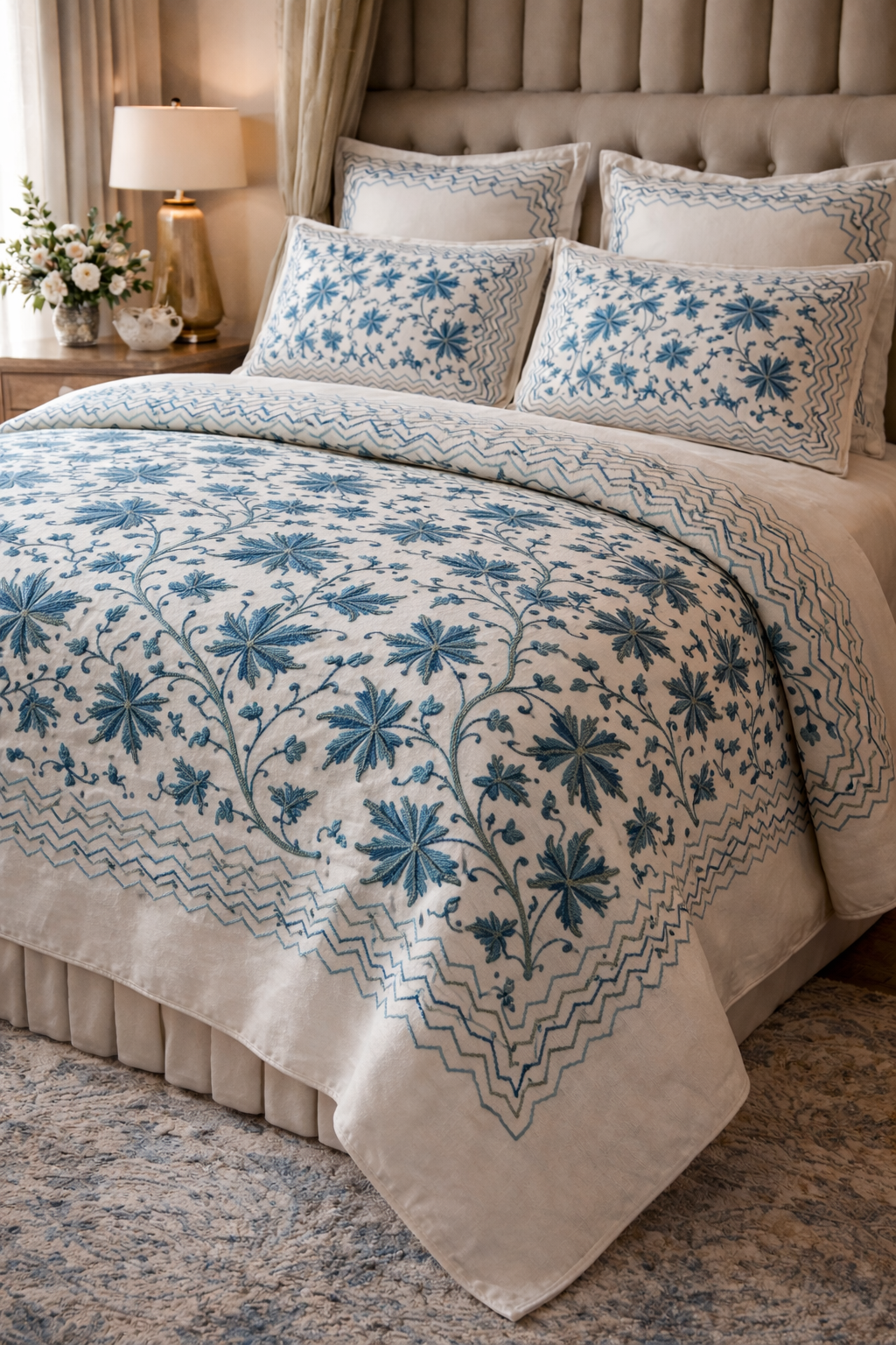 An ivory bedcover with blue Kashmiri embroidery, bringing refined luxury and timeless grace.