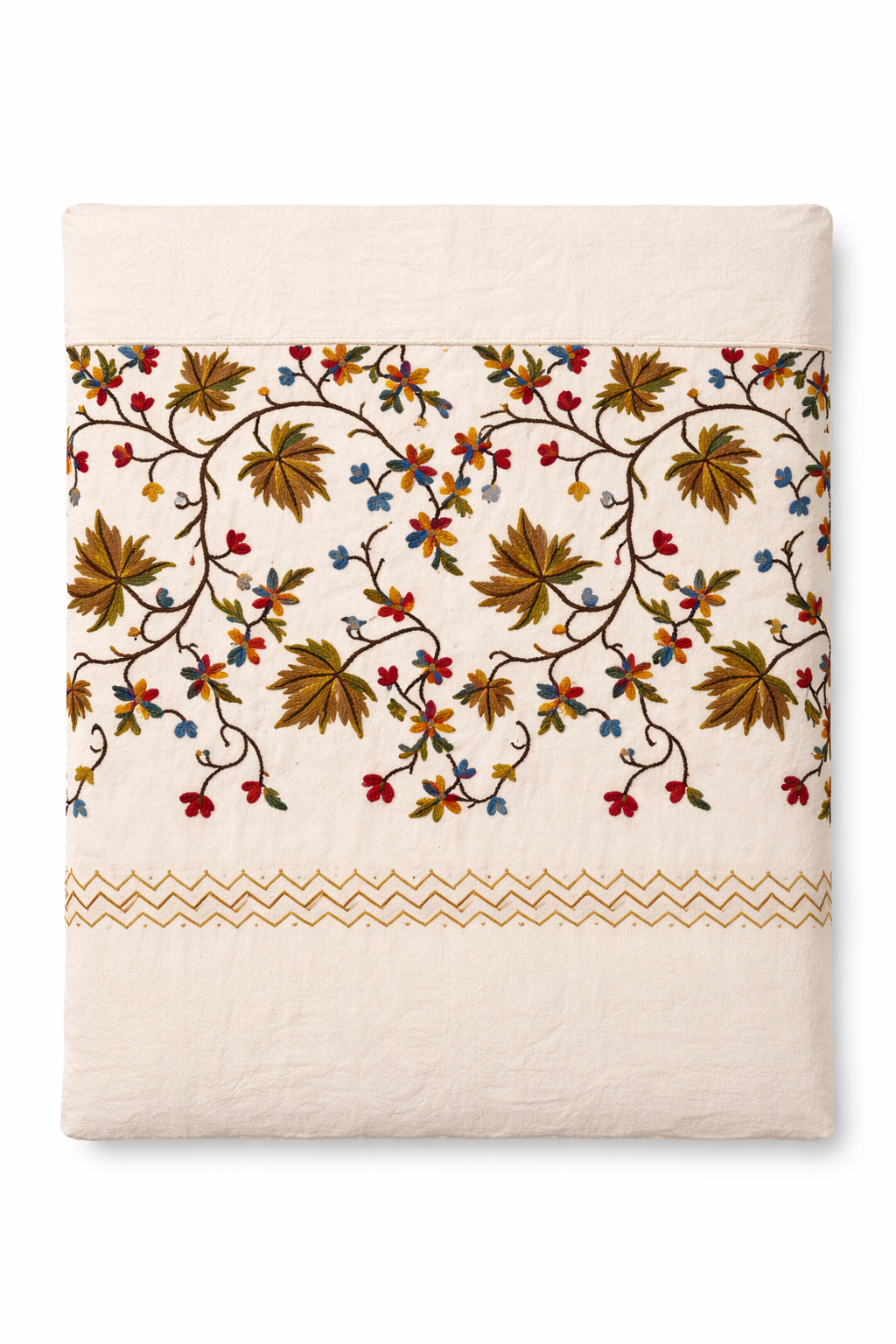 An ivory bedcover with multicolour Kashmiri embroidery, bringing refined luxury and timeless grace.