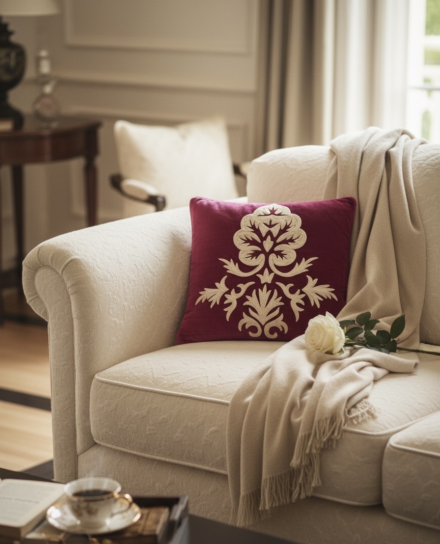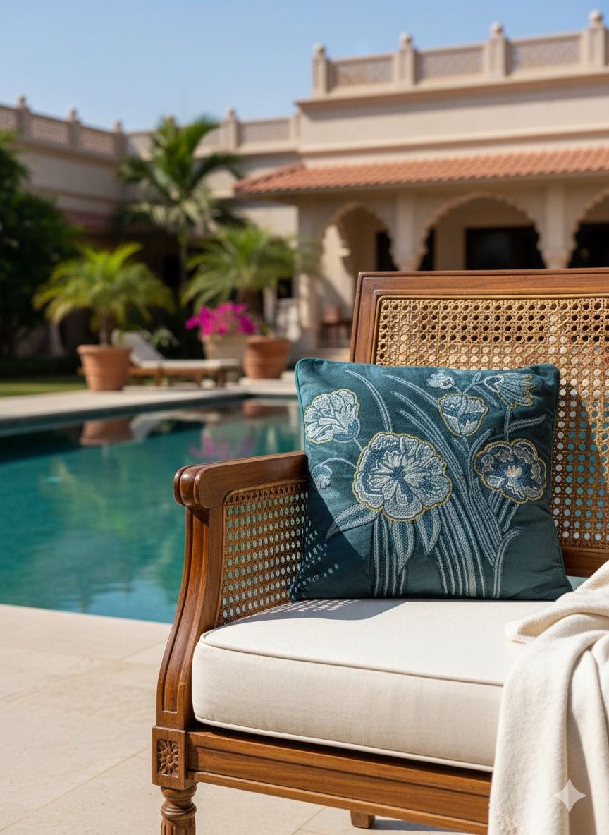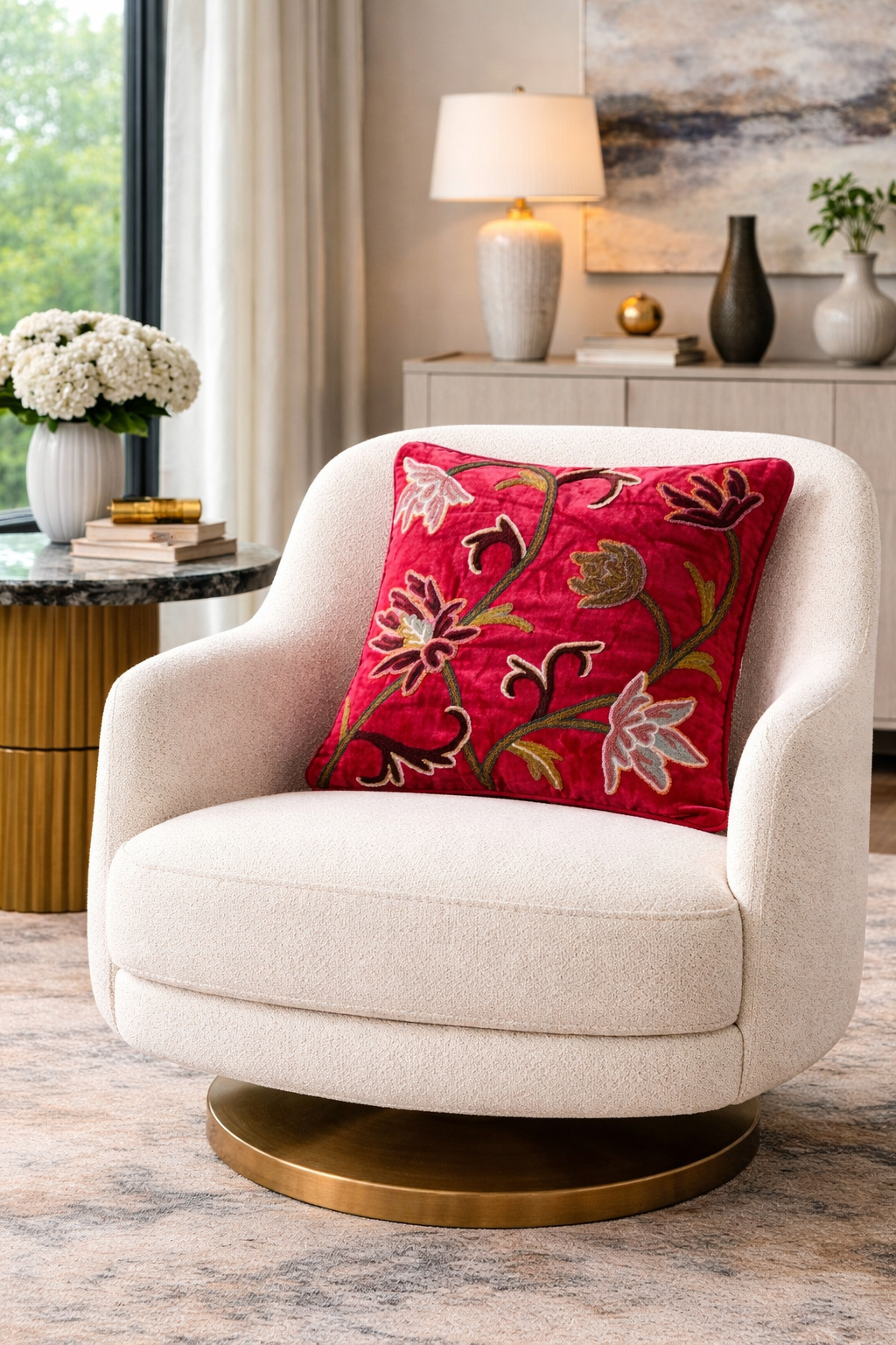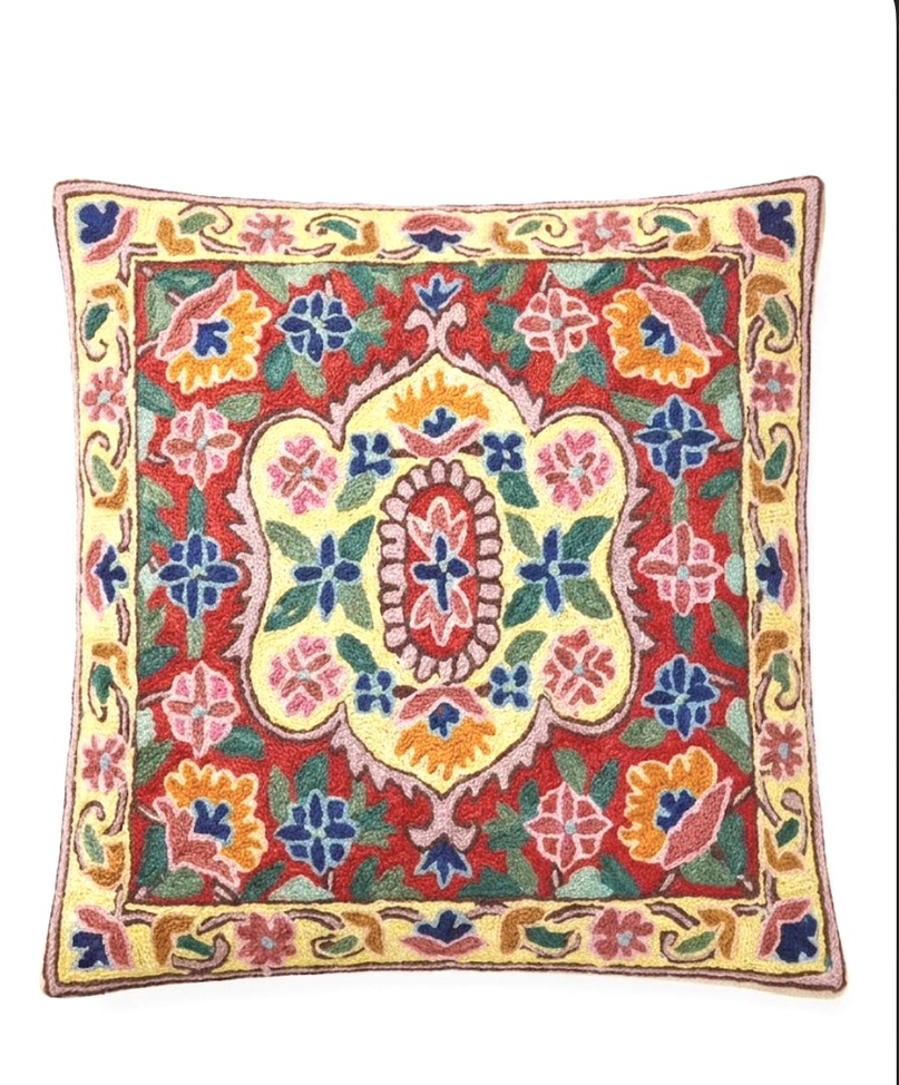 Pomegranate bloom, steeped in deep red richness and intricate Kashmiri embroidery.